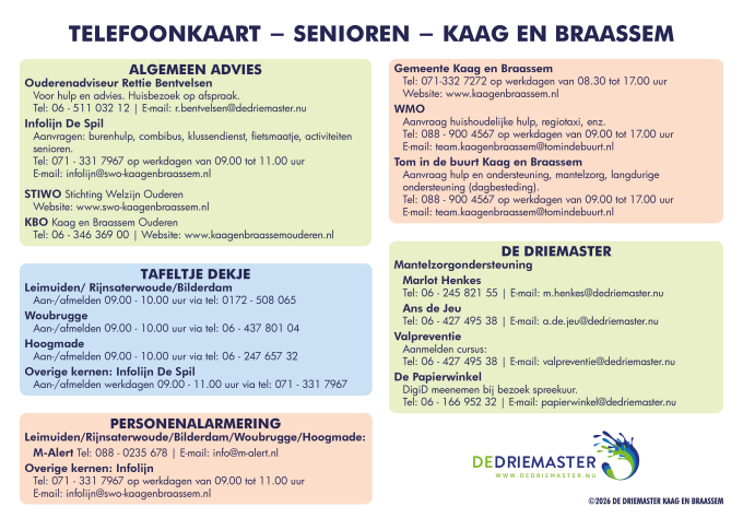Op deze pagina kunt u de digitale versie van de telefoonkaart downloaden. Deze telefoonkaart wordt door de vrijwilligers uitgereikt tijdens de welzijnshuisbezoeken 80+. Op deze kaart leest u allerlei essentiële informatie voor senioren, zoals hulp bij vervoer, personenalarmering en hulp bij zorg.